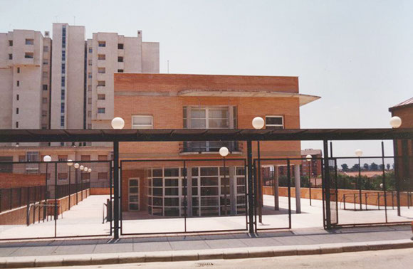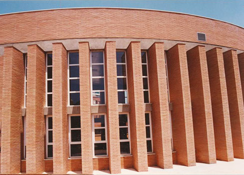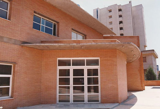 En este proyecto se generó una plataforma horizontal en el centro del solar para absorber el desnivel de la calle. Sobre ella se posa un edificio separado de las medianeras con dos cuerpos diferenciados, uno rectangular de dos alturas y de desarrollo longitudinal, y otro con forma curva que enmarca el fondo del edificio. El acceso a la plataforma se realiza mediante escalinatas y rampas que permiten un recorrido secuencial con diferentes perspectivas del inmueble. Se proyectó una composición volumétrica equilibrada entre el sobrio y racional paralelepípedo que alberga las oficinas, y el volumen más orgánico destinado a salón de actos. Al primero se le practicó un juego de volúmenes añadidos y restados que le daban una apariencia menos rígida al conjunto, como se observa en el porche del extremo y en el cuerpo de acceso. Con la composición lineal de huecos y el aparejo de ladrillo se contribuyó a potenciar el sentido longitudinal del edificio. El cuerpo del salón de actos situado al fondo del conjunto, tiene una proporción trapezoidal en su planta. Sobre la base menor se encuentra el escenario, mientras que el lado opuesto de mayor dimensión y trazado curvo, se descompuso en un juego de luces y sombras mediante esbeltas pantallas de ladrillo acentuando la focalidad radial de la planta del salón de actos.