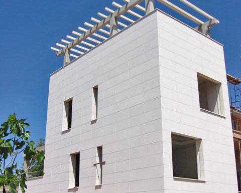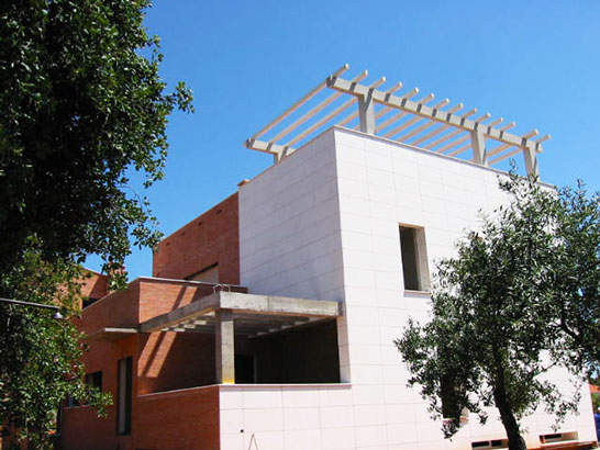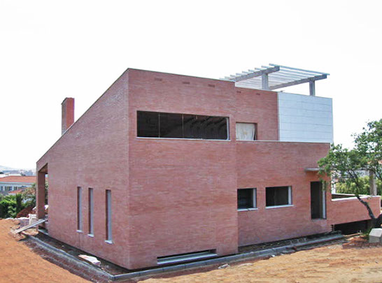 En esta actuación se proyectó un edificio aislado distribuido en dos alturas sobre la rasante del terreno. La planta baja se dedicó a zona de uso diurno y la planta primera a zona de noche. También se proyectó un semisótano con acceso desde el interior de la vivienda como espacio de desahogo. La conexión entre las plantas del edificio se realiza por un núcleo de escaleras dispuesto en su centro. Se buscó un juego de volúmenes que representara la adaptación del inmueble al terreno inclinado, que identificara las diferentes zonas y usos de la vivienda y que le diera una impronta exclusiva que la diferenciara de las otras edificaciones unifamiliares del entorno. Para ello se dispusieron una serie de prismas maclados unos con otros, rematándose con cubiertas inclinadas o planas en función del uso desarrollado en su interior. Los materiales y texturas empleados favorecen la lectura y entendimiento de todo el conjunto: se utilizó fábrica de ladrillo cara vista en tonos rojos en la mayoría de la vivienda, y aplacado de piedra natural tipo Bateig para el cuerpo prismático del extremo, que acentuaba su carácter monolítico, convirtiéndolo en elemento de remate del conjunto y referencia en la zona.