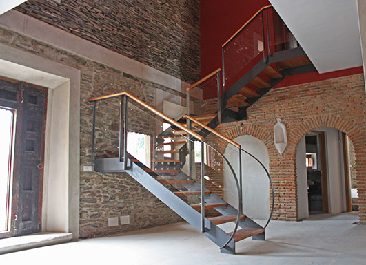 Este proyecto de rehabilitación integral afecta a dos edificios medianeros, ocupados por viviendas características de la arquitectura popular de la zona de los llanos de Cáceres. Dentro de los elementos que se mantuvieron, dado el valor patrimonial e histórico del conjunto, se puede reseñar como el más destacado la chimenea de fábrica de ladrillo y pizarra, coronada por una sillar de granito labrado. Para su correcta conservación durante la obra y acabado final, se proyectó su tratamiento mediante medidas ingenieriles y de la más delicada restauración. En la intervención se mantuvo la configuración en planta de ambos edificios, liberándolos de aquellos espacios resultantes de reformas y agregaciones que dificultaban la lectura de su ordenación primigenia, respetándose la macla que generaban estos volúmenes en la esquina de contacto entre ambos. Además se mantuvo la independencia de uso de las dos viviendas, aún siendo de un mismo propietario. Esto se debe a que parte de uno de los edificios se destinó a residencia permanente de los familiares del promotor, mientras que el resto de la actuación se destina a segunda residencia, disponiendo el conjunto de más de 7 dormitorios dobles y sus respectivos baños. La disposición de los huecos se estudia detenidamente buscando el mejor ajuste a los espacios interiores a los que sirven.
